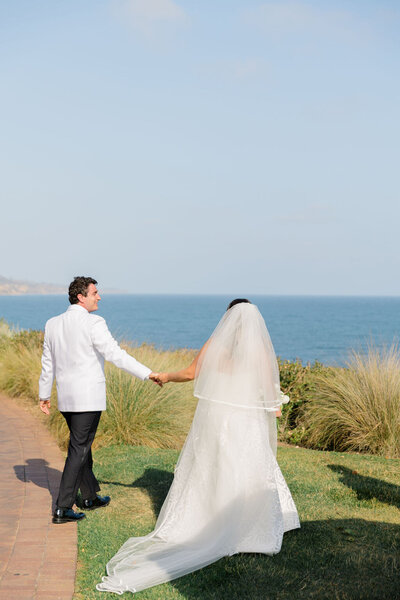 Inspired by al fresco dining and celebrations under the Tuscan Sun, Sarah and Lucas wanted their Terranea wedding to be the perfect blend of West Coast living and Italian festivity. Intricate Guipure lace tablecloths set the scene for vintage Oscar de la Renta dishes and fresh tomato vines that weaved themselves amongst the reception tables. After heartfelt vows set against the Pacific Ocean, guests were greeted with Hugo and Aperol spritzes under lemon striped and orange paisley umbrellas. As the sun began to set and the dancefloor opened, the Father of the Bride uncorked Port bottles that were purchased the year the bride was born, saved and cherished for this exact moment.